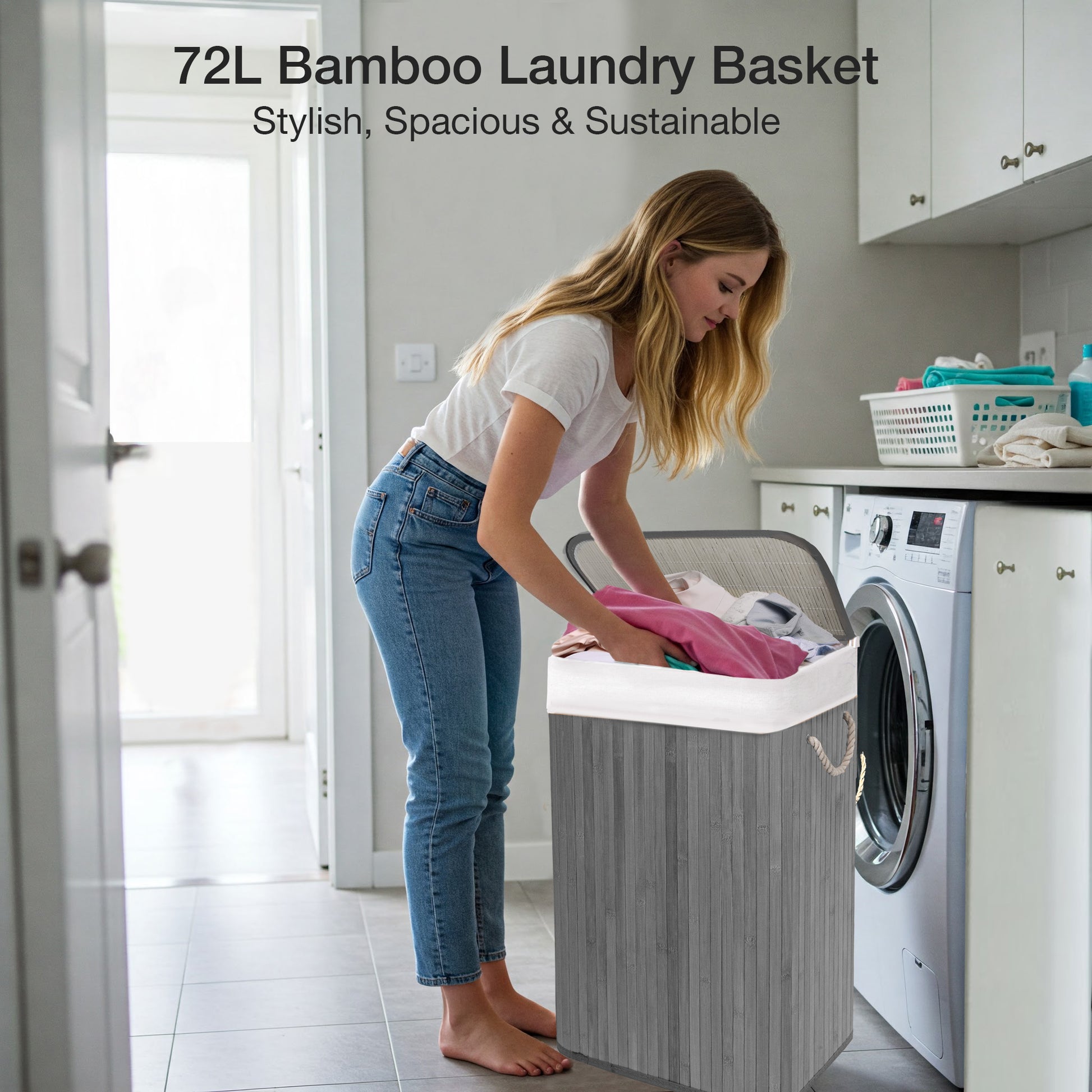 - Laundry Basket with 2 handles: Equipped with 2 rope handles on each side which helps basket to be easily carried to anywhere you want. Also featuring a bamboo swing lid which makes it convenient one-handed operation for opening and closing while in use. The lid prevents your laundry from moisture, odours, and dust.