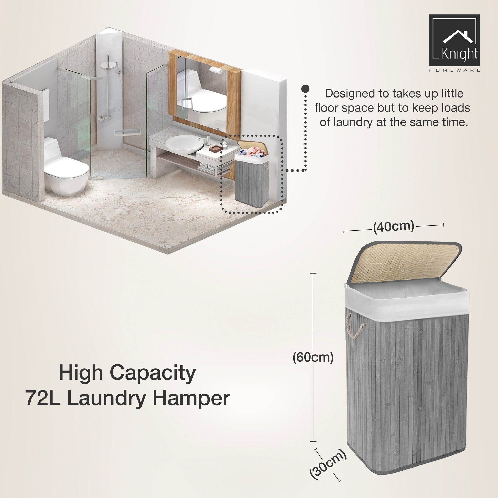 KNIGHT Bamboo Laundry Basket, 72L Laundry Hamper with Removable Washable Lining, Easy Assemble Easy Folding Storage Bin 40x30x60 cm – Grey