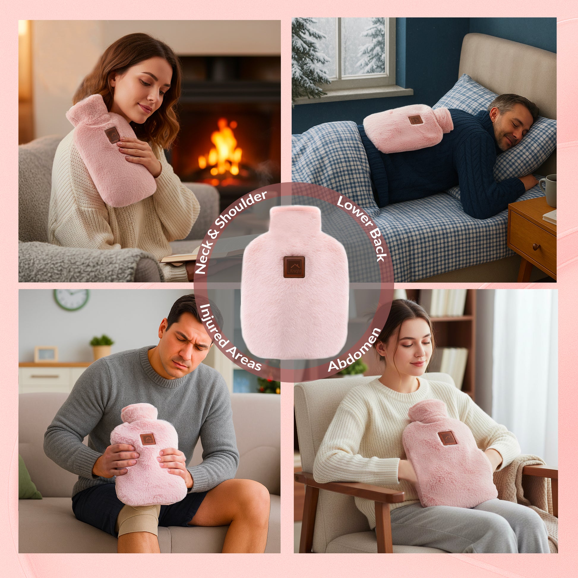 - Portable Design: Our pain Pain relief hot water bottle comes with a rechargeable and portable design, making it the perfect companion for on-the-go pain relief. Whether you're at home or outdoors, this hot water bottle with soft cover is easy to carry and use whenever and wherever you need it.